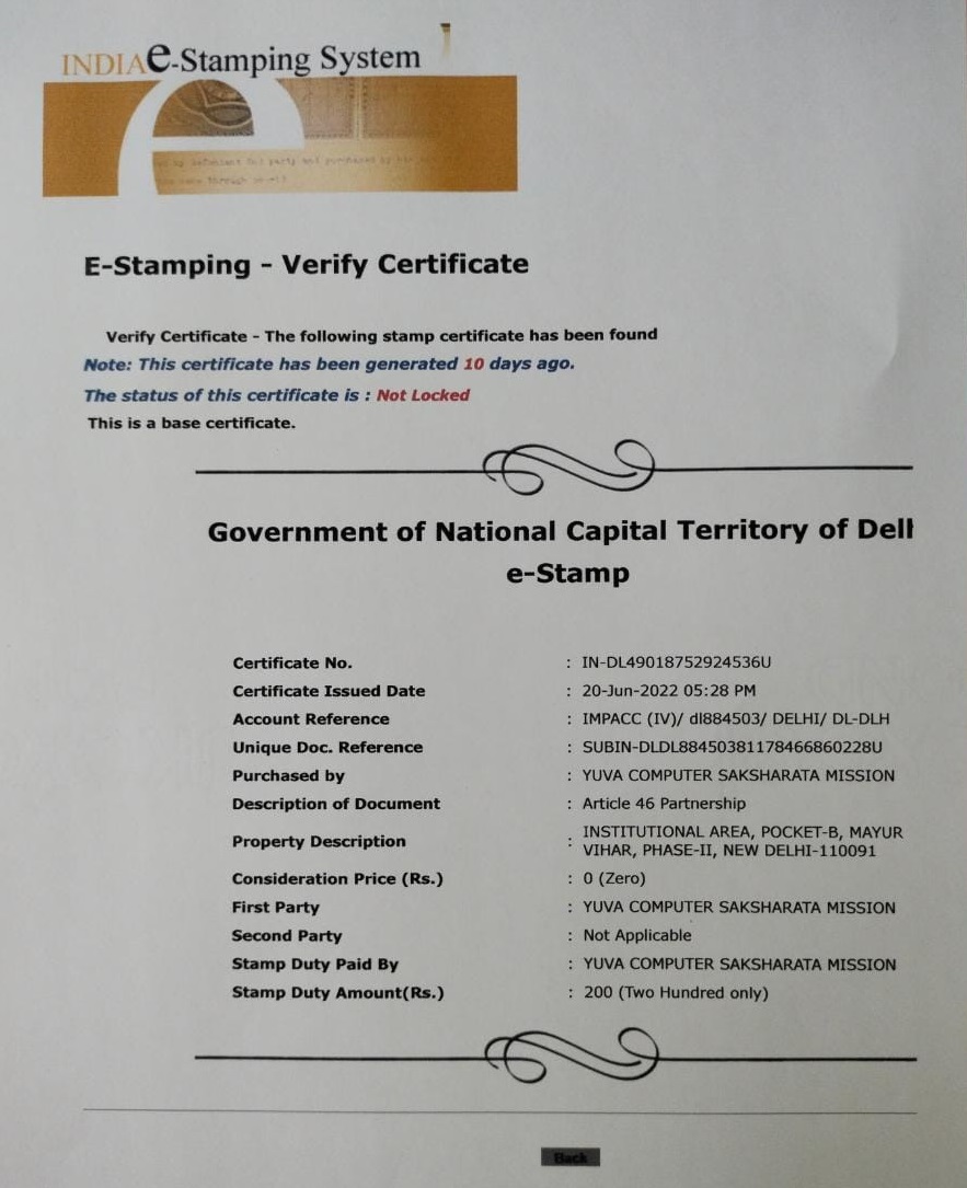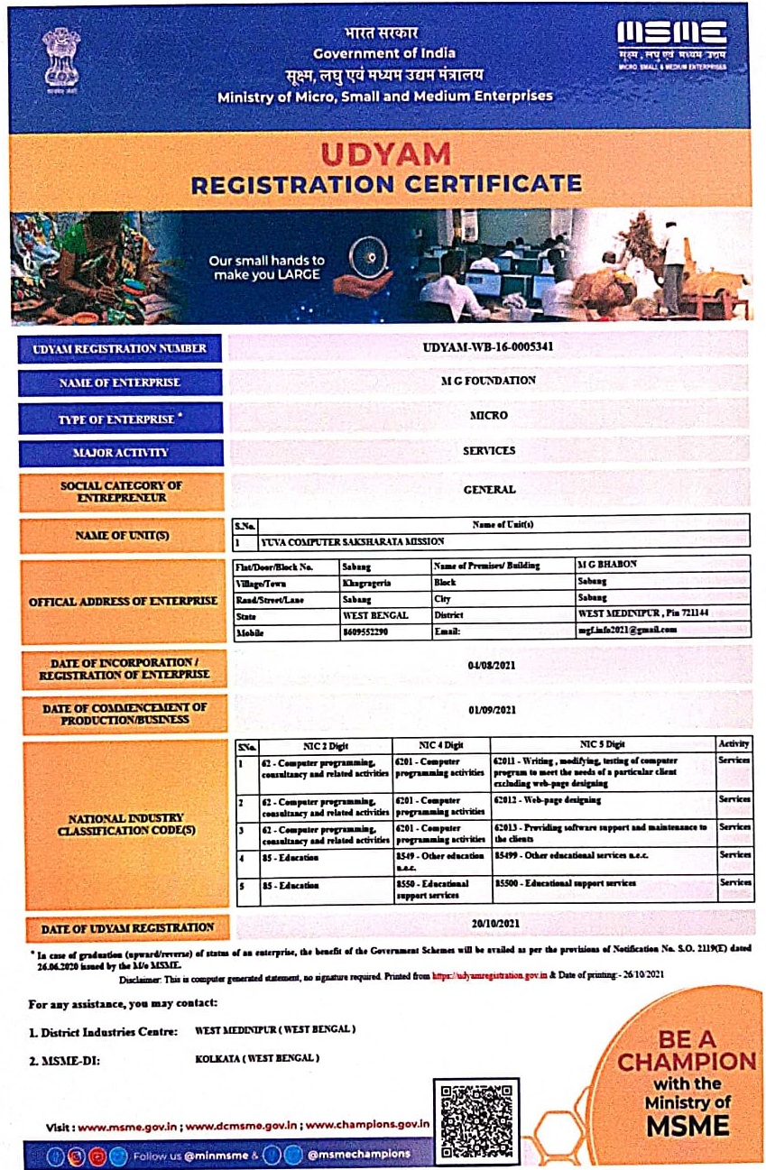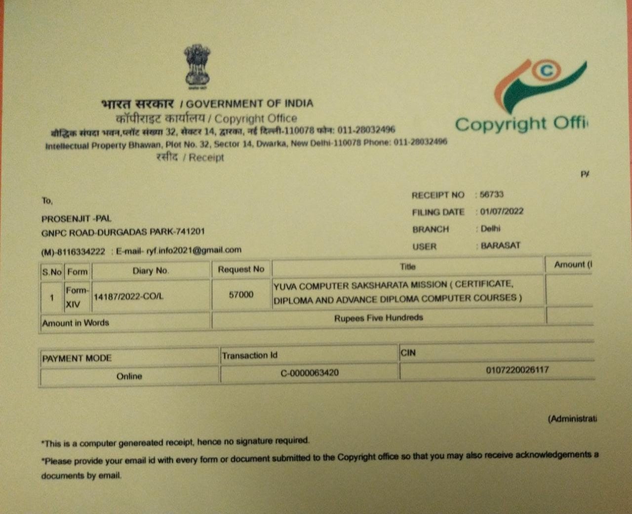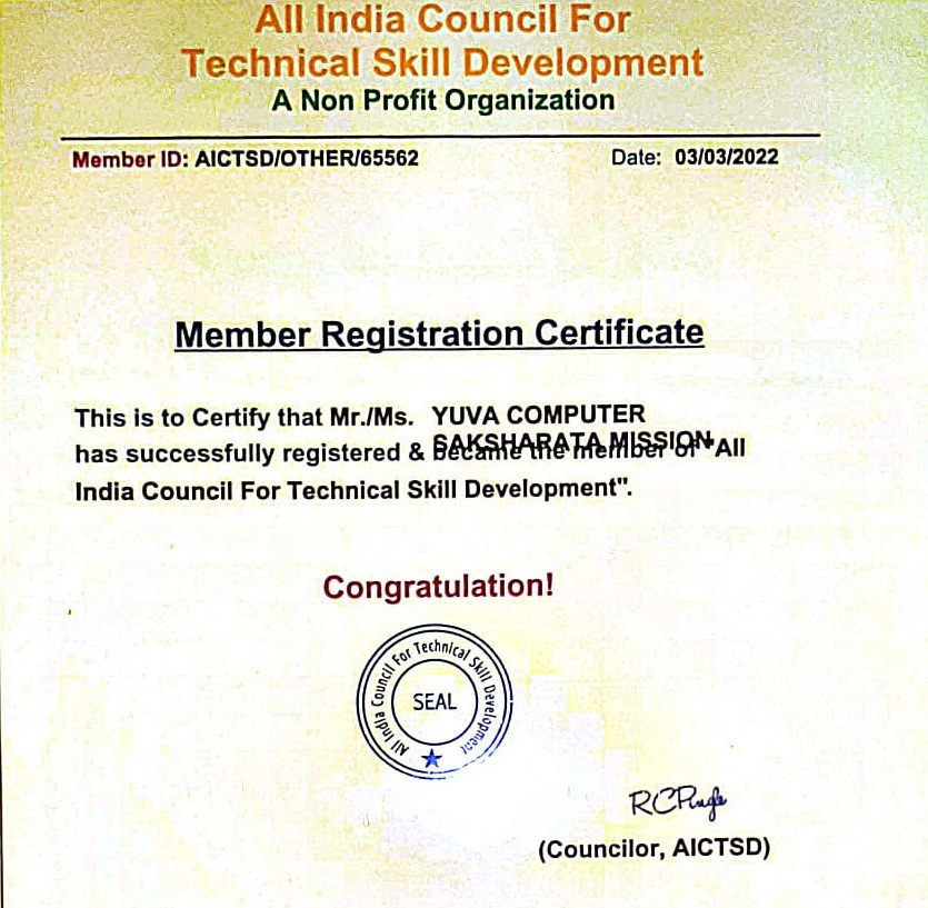 Yuva Computer Saksharata Mission is a Top Computer, Vocational & Technical Education Institute in all over India, which is a national programme of information technology education and development. Yuva Computer Saksharata Mission (A unit of Yuva Foundation) an ISO 9001:2015 Certified Organization, an Autonomous Body, is Registered Under TR Act. Govt. of West Bengal (Reg. No- IV - ********). Registered Under Trade Mark Act,1999, Govt. Of India